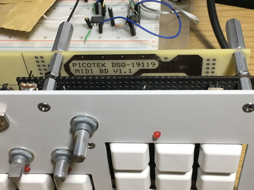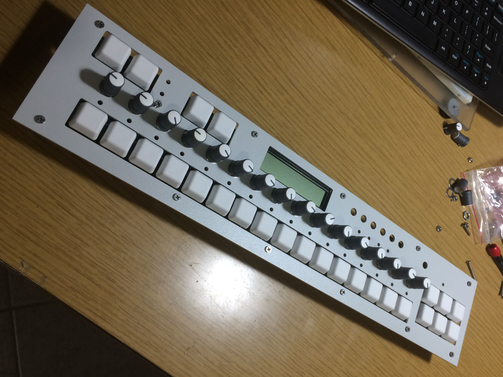 Cherry MX Red key switches, a character LCD, 16 knobs to assign to CV/Gate, 6 function buttons, a rotary encoder, and MIDI In/Out/Through with also trigger outputs and MIDI out for a drum controller.
