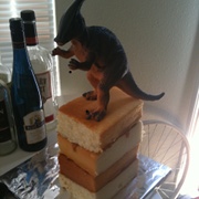 So my original thought was that I was going to make a cake in the form of a building with a King Kong toy taking over it. There was to be a scrolling sign with Jeannette's name on it (PIC part of the project) and other little toy figures sticking out the windows (which were also going to be made of chocolate bar squares), and other figures on the base. Well I couldn't find a King Kong toy so used a dinasour toy instead.